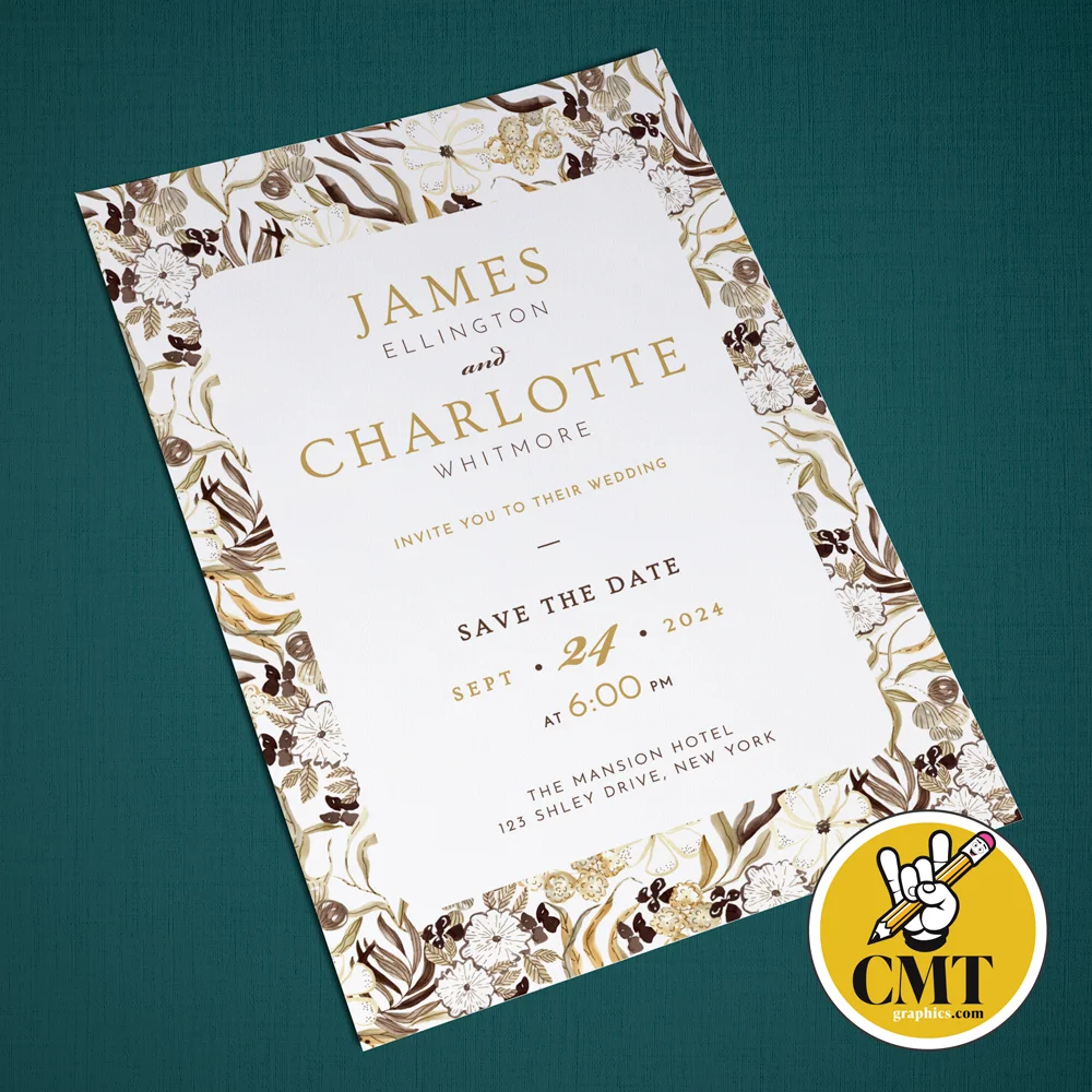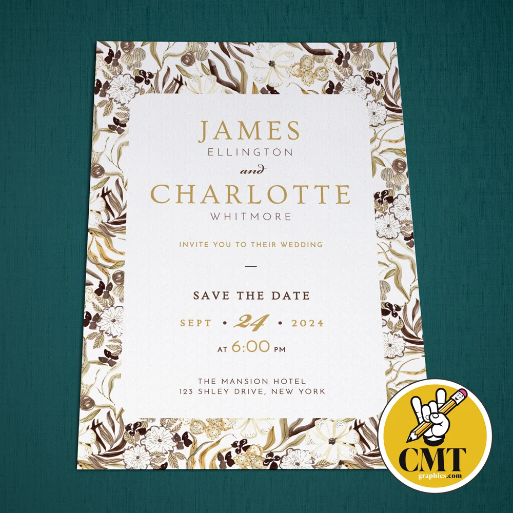 Featuring “hand-drawn” style florals in muted olive, beige, and brown hues, this digital boho wedding invitation exudes sophistication and warmth. The white-centered layout provides clarity, while the faux-gold lettering adds a luxurious feel, without the need for foil stamping.