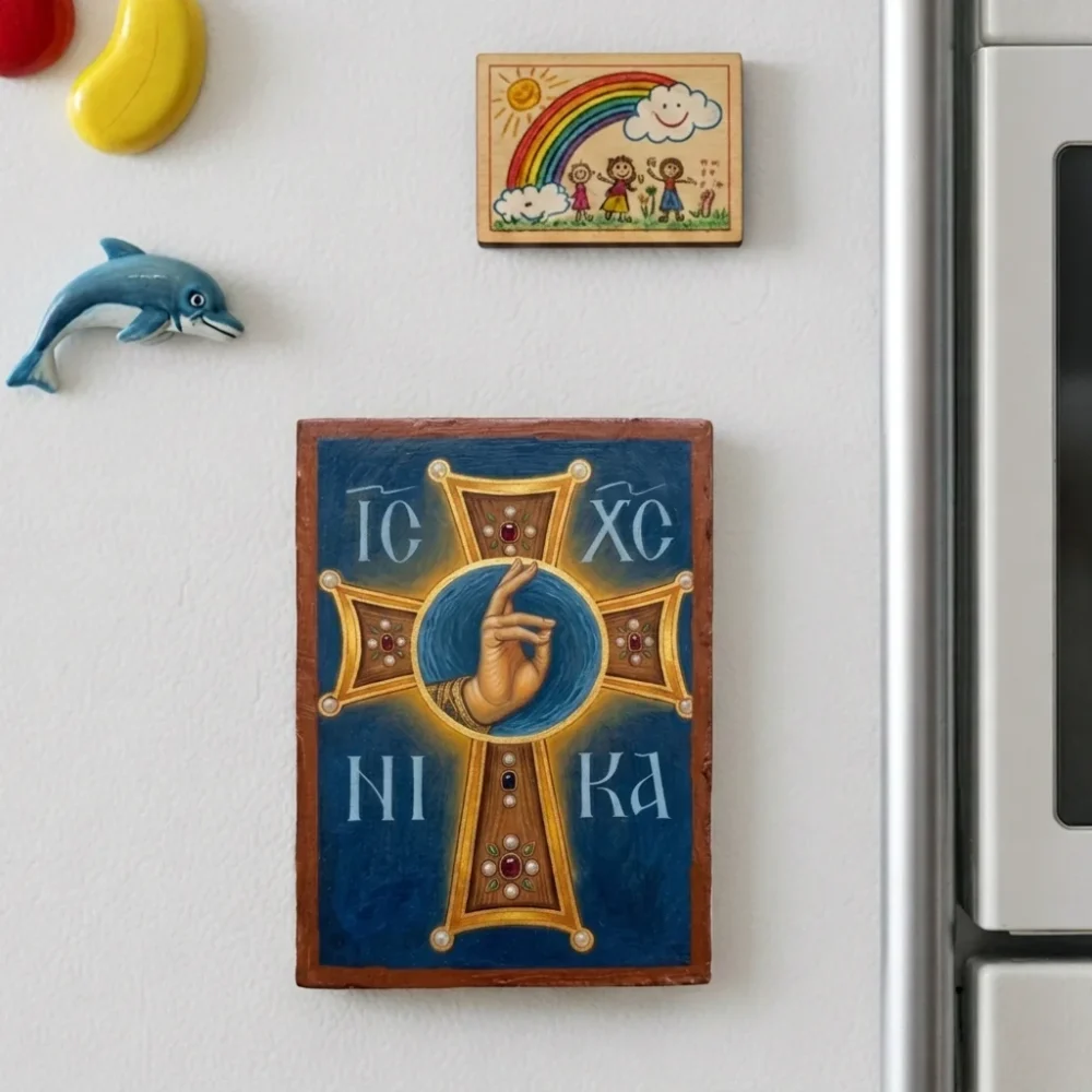 Hand-finished in Brooklyn, New York on solid wood using a professional decoupage technique, this icon is made with care and reverence for Orthodox tradition. It also features a strong magnet on the back, making it easy to display in a prayer corner, office, devotional nook, or other sacred space. Its compact yet bold design makes it especially fitting as a thoughtful Orthodox Christian gift for housewarmings, name days, personal veneration, and everyday inspiration.