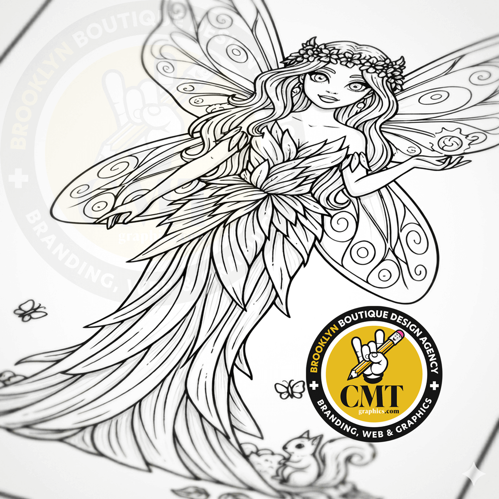 Step into a whimsical world with this premium digital coloring page featuring Lyria Moonwhisper, a graceful fairy poised in ethereal beauty. Her expansive wings swirl with intricate patterns, a flowing gown of leaves and vines drapes elegantly, topped by a delicate floral crown. Long hair cascades freely as she cradles a glowing orb, surrounded by playful butterflies, a curious squirrel, and lush foliage—every fine line invites your imagination to flourish.